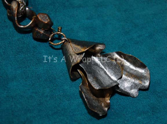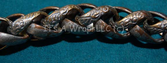 Description: An elaborate ornamental chain located with Klingon accessories. The item is made to appear as if woven from lengths of metal with leaf like adornments at the ends. The chain shines with tinted gray, gold, and silver when it catches the light. The item measures approx. 34 inches. A perfect addition to an already existing Klingon costume.