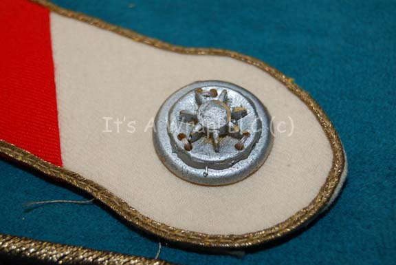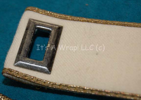 Description: A set of Starfleet trainee division strips like those appearing in Star Trek VI: The Undiscovered Country for wear by an officer trainee in the command division. The items are a white shoulder strip with red flashes, gold trim, and a molded resin ‘security disk’ painted metallic silver with a sleeve strip of gold trimmed black backing for a corresponding white fabric strip with a single red flash. The sleeve strip reveals a series of puncture marks likely to have indicated rank and commendations as well as tenure of service, the shoulder strip also features puncture marks. The items retain threads from costume removal.