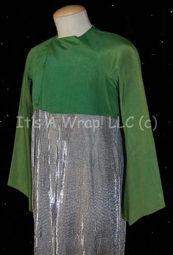Description: A costume featured in Star Trek VI: The Undiscovered Country for wear by aides to the president of the United Federation of Planets. The costume is composed of reflective silver colored folded over fabric making up a long dress topped with green shoulder straps. Over it is worn a cropped green nylon jacket with long sleeves and beveled cuffs. The costume appears briefly in the feature film trailer to depict the Federation President blind as much of his species is but the costume is rarely visible in the theatrical or DVD release. Costume continuity photographs also depict the lot with additional raw wool garments that were developed for the Star Trek: The Next Generation episode “Angel One” but which are no longer available.