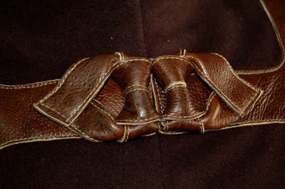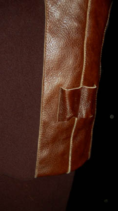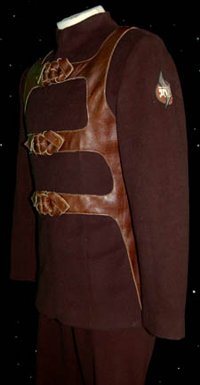 Description: A costume featured in the Star Trek: Enterprise episode “Oasis” in which the crew of “Enterprise” locates a crashed alien ship populated by holographic survivors. This two piece costume is a gray full length jumpsuit with a stretchy blue crimped fabric chest and a matching costume coat with similar sleeves. A sewn in Enterprise tag reads ‘Mike Stanosek #20’ and a costumer’s tag reads ‘Enterprise 20, Mike Stanosek, Kantare Aliens’.