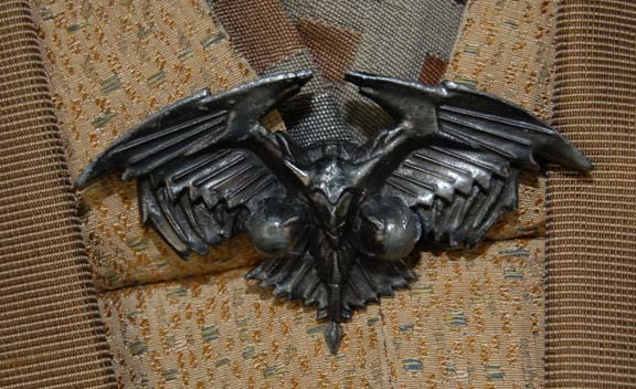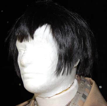 Description: A costume featured in the tenth Star Trek feature film “Nemesis”. These are the robes of a member of the Romulan Star Empire Senate, it is composed of a gorgeous gold under robe with long sleeves that zip to fit at the cuff, have a slit up the legs, and features interior collars to appear more flush in the same multi-colored square style as the Romulan fleet uniforms from the same movie. The outer robe is made of a subdued gold fabric featuring thin, black, pinstripes, a metallic-copper interior lining with elbow length, kimono-inspired bell-sleeves, and an open front that has matching tassels sewn on. All of this goes over a sage-colored dickie with white dots that ties up the back and features a Mandarin style collar. This costume includes a dark-gray, resin cast, pin-backed Romulan senator’s badge, a black, Romulan--style wig and extra pair of shoulder pads. All three garments have a pinned in tag that reads ‘Jonathan Engle’ This elaborate piece is made to provoke the most austere appearance in its wearer.