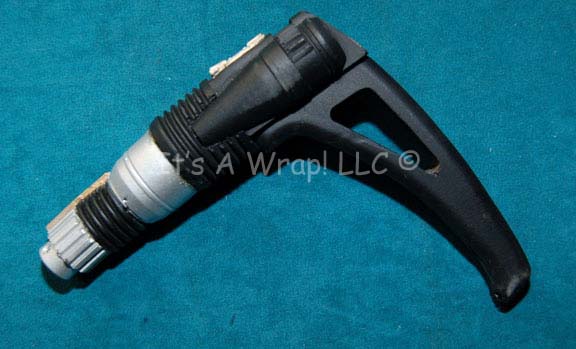 Description: A prop weapon similar to those featured in the Star Trek: The Next Generation episode “The Most Toys” and episodes like “Higher Ground”, “Starship Mine” and “Preemptive Strike”. The item is made from molded black foam-rubber and painted metallic silver and gold accents. The hand grip is soft and flexible, but holds its shape, and is sturdy enough to keep the item’s overall appearance while at rest or in hand. The top of the item has an asymmetrical seam running its length that offsets its molded accents on top that suggest hardware. The item measures approx. 6.5 X 5.75 X 2 inches.
