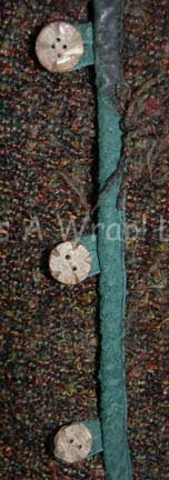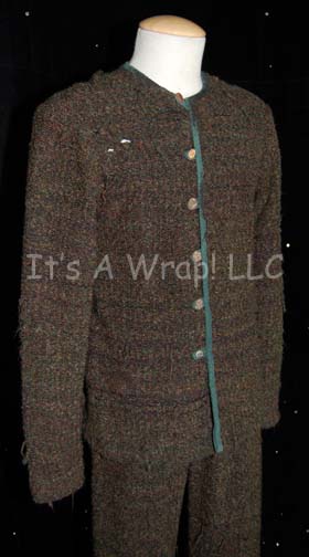 Description: A costume featured in the Star Trek: Enterprise episode “Stratagem”; herein “Captain Archer” (Scott Bakula) and the crew of the “Enterprise NX-01” try to trick the designer of the Xindi Super Weapon into giving up the coordinates of where it is being tested. This costume consists of a long-sleeved, boucle wool sweater featuring various shades of green and brown, dark-green trim down the front, carved buttons, and matching trousers with drawstring on the front. Both items are lightly distressed to give the appearance of extended wearing in potentially hazardous conditions and feature sewn in Enterprise tags that read ‘Scott Bakula’.