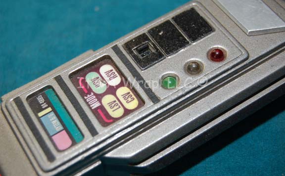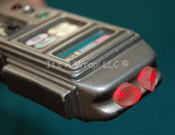 Description: A hand prop featured in the Star Trek: Voyager episode “The Haunting of Deck 12” which saw use by “Seven of Nine” (Jeri Ryan) during a loss of ship’s power. The item is a molded resin scanner made to appear ergonomic, painted metallic silver and pewter, the item features multiple embedded lights that function on a V26 PX sized 6volt battery held internally and are activated by way of a switch on the face. Yellow and Red lights come to life on the face of the item with a blinking green light, and a pair of red sensor nodes at the end cast a glow on nearby objects. The two inset ‘display screens’ depict LCARS style (Library Computer Access and Retrieval System) information. The item measures approx. 5 X 2 X 1 inch.