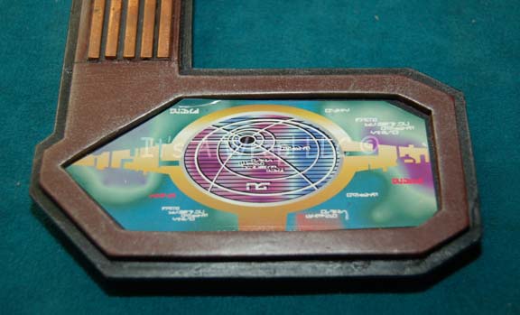 Description: A prop item featured in the Star Trek: Voyager episode “Body and Soul”; wherein “Seven of Nine” (Jeri Ryan) must download “The Doctor’s” (Robert Picardo) program into her neural implants to save him from a race of holo-phobic aliens who are at war with the holograms they created and refer to them as “holographic insurgents”. This item is a P.A.D.D. (Personal Access Display Device) used in the medical bay of the Lokirrim ship; it is resin cast in brown, roughly the shaped of a squared-off capital “C”, copper-colored, textured accents in the middle where it would be held, black trim and further black, raised, accents on the back. Irregularly shaped “screens” with a graphical application of a gold oval divided into four parts with a background print of bolts of electricity, horizontal, black detail, Lokirrim script and around the oval and a red ball of energy in the middle; the second “screen” is similar but with less script and what appears to be an off-center targeting diagram. The item measures approx. 7.5 X 4.5 inches.