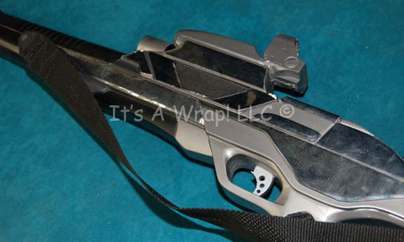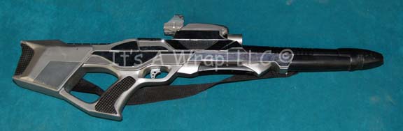 Description: A prop Starfleet Type III Mark III phaser rifle made specifically for Star Trek X: Nemesis. The item is a solid cast resin prop energy weapon painted metallic gunmetal with metallic chrome colored adhesive applications, a black painted muzzle, textured grips and butt stock, a fully intact ‘sighting scope’, a cavity for a flashlight, and a black nylon shoulder strap fixed in a static position. The shoulder strap adhesive in the stock is no longer holding, but retains its appearance. The accompanying flashlight is a ‘Surefire’ name brand light with a twist activation and a thumb button activation on the end. The light is powered by two Surefire name brand SF123A sized 3volt batteries held internally which retain power from production use and are very bright! The item measures approx. 10.25 X 33 X 2 inches and depicts only the slightest of scuffs on the barrel end and a few chips in the paint on the butt stock edges. This item represents the last of the fully intact, solid resin props of this category, in this configuration, that has not been categorized previously. It is the last known Nemesis-style rifle with an intact ‘sighting scope’.