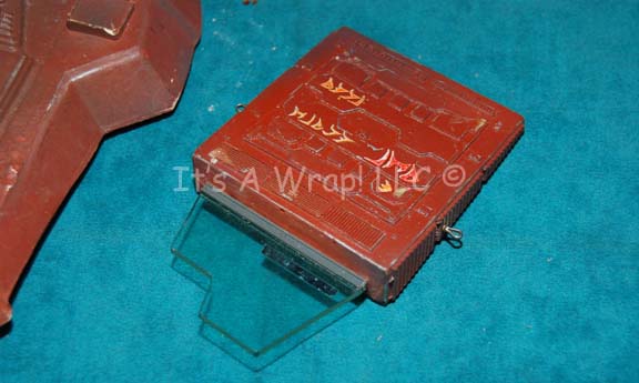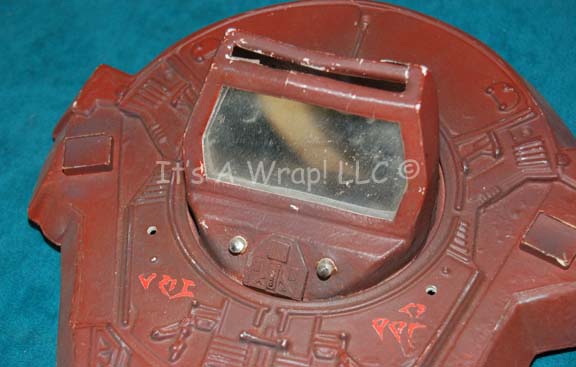 Description: A prop data card reader appearing in Star Trek VI: The Undiscovered Country during scenes taking place in “Chancellor Gorkon’s” (David Warner) chambers on “Qo’noS One”. The item is made from rust colored injection molded plastic with multiple raised details, Klingon iconographic decals, a raised mirrored ‘display screen’ with lights protruding underneath. The lights activate by way of a bottom mounted switch and are powered by a single 9volt battery to allow for sequentially flashing red lights. The top of the display screen features a slit to allow for the accompanying Klingon data card to be placed within. The data card is sturdy molded resin with a translucent acrylic slide positioned on the end. This item also features raised details and Klingon iconographic lettering as well as a pair of metal loops positioned on the sides, possibly for the attachment of a chain. The desktop monitor has seen some damage due to time and storage conditions. The top of the screen where the card slit enters is cracked thought intact, the electronics held internally are loose inside if they were ever adhered to the structure of the item. A series of no scratch pads are placed on the bottom of the item and dried pink colored Klingon special effects ‘blood’ remains from set production use. The items measures approx. 9 X 8.5 X 3 inches and 3.25 X 4.5 X 0.75 inches. Look for this rare item in the Star Trek VI DVD featurettes under the title “Penny’s Toy Box”.