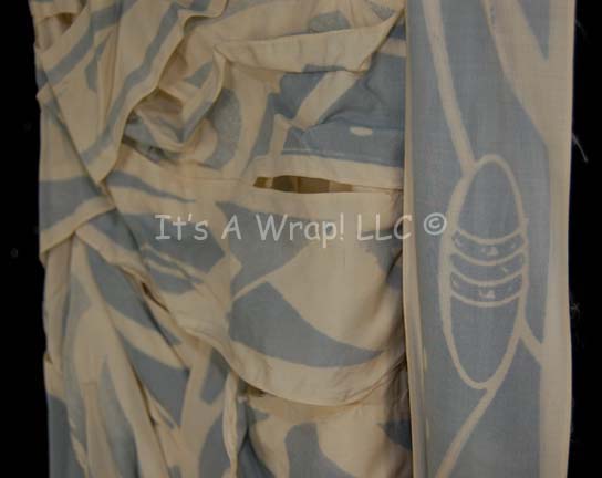 Description: A costume featured in the Star Trek: Voyager episode “Emanations”; wherein “Harry Kim” (Garrett Wang) becomes trapped on an alien planet while studying mineral deposits with “Commander Chakotay” (Robert Beltran) and “B’Elanna Torres” (Roxann Dawson). This costume consists of long-sleeved, long tunic and matching trousers made to look like they composed strips of blue and white fabric, almost like mummification wrappings; the wrappings themselves have a light-blue iconographic design, are applied at all angles in different lengths but seem to all be the same widths. Included is a tan undergarment and extra strips of the fabric. A sewn in Voyager tag reads ‘Garrett Wang’, a second tag reads ‘John Tampoya’, and a costumer’s tag reads ‘Harry Kim, Garret Wang, Voyager’.