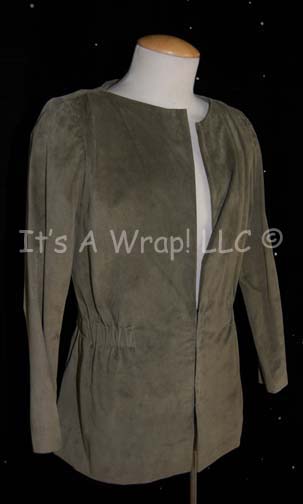 Description: A costume element featured in the Star Trek: The Next Generation episode “Chain of Command”; wherein “Captain Picard” (Patrick Stewart) is captured by Cardassians while on a secret mission. This piece is a gray-green, long-sleeved jacket featuring a form-fitting elastic waist, a low zip up the front from the trim to the belly, and matching nylon interior. The sewn in Next Generation tag is inscribed ‘Patrick Stewart' despite attempts to black out the tag, the costumer’s tag is inscribed similarly with ‘236, Chain of Command, Picard’.