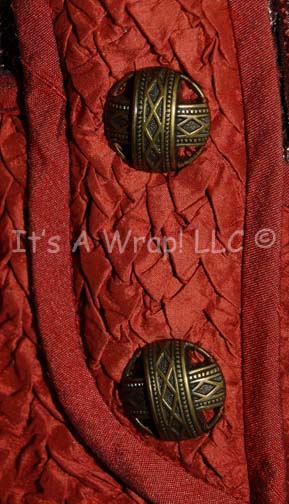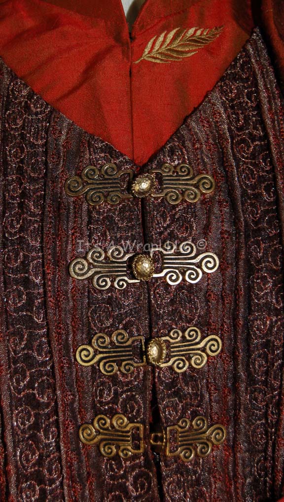 Description: A costume featured in the Star Trek: Enterprise episode “The Awakening”; wherein “Captain Archer” (Scott Bakula) and “T’Pol” (Jolene Blalock) encounter a radical sect of Vulcans called the “Syrrannites” who are being blamed for the bombing of the “Earth Embassy”. This costume is “Surak” (Bruce Gray), the Vulcan ‘Father of Logic’, an iridescent silk tunic with sage-colored embroidered leaves, woven rust-colored, overall-style, trousers; a waistcoat made from puckered silk with faux brass buckle/clasps, brass colored buttons, a sleeveless maroon, robe that features textured gold thread brocade, tiny burgundy thread flowers, carved, faux buttons, clasps and an interior waist belt with clasps. A full-length, copper-colored robe featuring a white thread checkerboard design, a raised waffle-board pattern on top, large, open, bell-sleeves, and attached hood. The components all feature sewn in Enterprise tags reading ‘Bruce Gray 084’ and the costumer’s tag reads ‘Enterprise 084, Surak, Bruce Gray’ and indicates the components. There is one hole in the knee of the left leg on the trousers; there is no indication as to whether or not it is intentional distress.