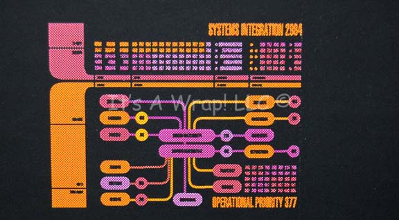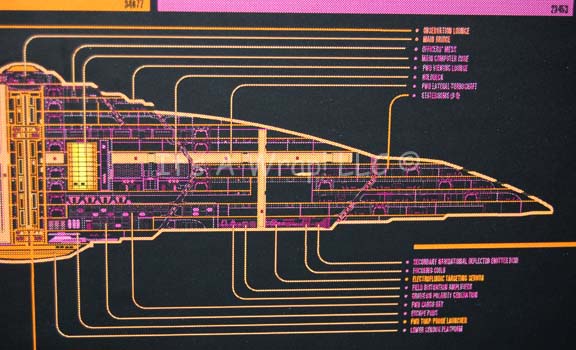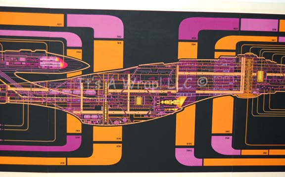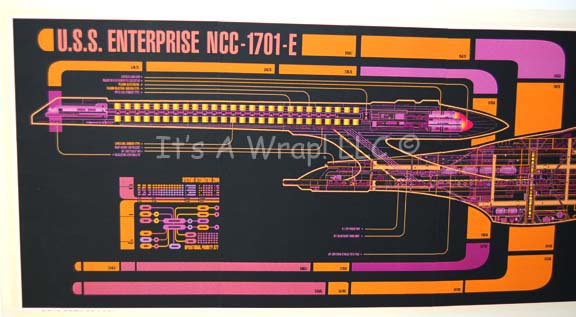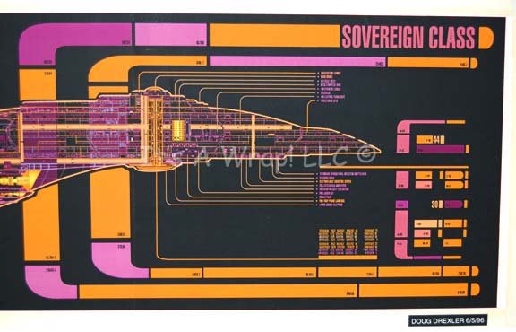 Description: A paper based color depiction of the “U.S.S. Enterprise-E” as featured in Star Trek VIII: First Contact. The item is a sheet of sturdy poster board with four color copies of the cross section Master Systems Display of the famous starship aligned to appear as a basis on which to build an LCARS style panel. The cross section details the location of several critical starship systems including the warp nacelles, turbolift shafts, Bussard collectors, shuttlebays in the primary and secondary hull, the warp core, deuterium storage tanks, the main bridge, the navigational deflector, the main computer core, and much more. The item is listed as “U.S.S. Enterprise NCC-1701-E” and “Sovereign Class”. An adhesive sticker in the lower right hand corner reads ‘Doug Drexler 6/5/96’. The item measures approx. 34 X 10.25 inches and features a protective layer of paper adhered to the reverse that wraps around the face of the graphics.