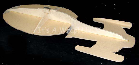 Description: A large, foam-core model of the “U.S.S. Voyager” used to test how the real model would look in various shots or next to other model ships. Composed of several parts, glued together, this model has the detail the final model has adhered to the foam-core, some of which is peeling off, and depicts damage from the removal of mounting rods on the dorsal and ventral sides. This item measures approx. 62 X 23 X11 inches.