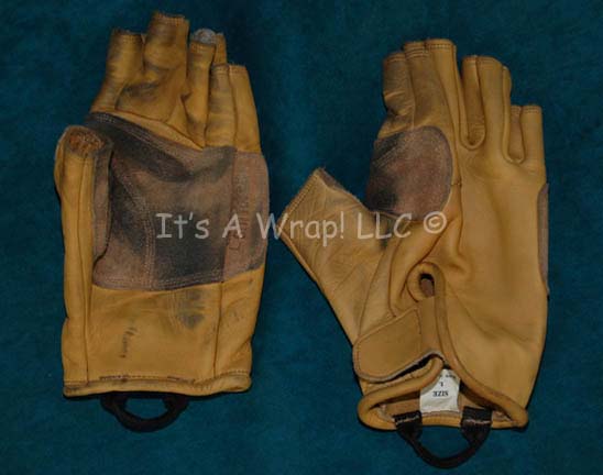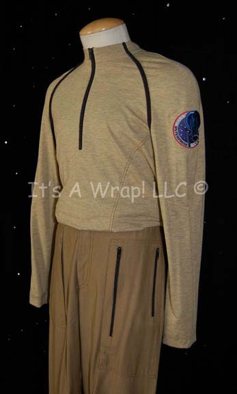 Description: A costume featured in the Star Trek: Enterprise episodes like “The Breach” and “Marauders”. This costume consists of a pair of khaki trousers with multiple zippered pockets and a form fitting long sleeved tee-shirt with black piping a center zip at the neck, and the famous “Enterprise NX-01” assignment patch sewn onto the left shoulder. A sewn in Enterprise tag denotes wear by various stuntmen and the costumer’s tags read ‘Enterprise, Stunt Mayweather, Kiante Elam, Kortney Manns’.
