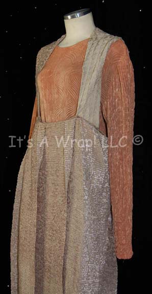 Description: A costume featured in the Star Trek: Voyager episode “Emanations”; wherein “Harry Kim” (Garrett Wang) becomes trapped on an alien planet and our reality is their afterlife. This costume is that of the doctor that examined “Harry” after he appeared on their world, it consists of a long-sleeved, full-length jump in a peach color and a stretchy, spandex-like fabric but with heavy pleated sleeves and a zipper down the back. Included is heavy toga/sash consisting of three different layers; the innermost a ‘wrinkled’ gray gown, on top of that a slightly iridescent gown with a diamond pattern, and, on top of both, a shear, tea-green colored sash with a raised, off-white floral pattern, straps, and numerous clasps and snaps. A sewn in Voyager tag in each reads ‘Jerry Hardin’ and a costumer’s tag reads ‘109 Emanations, Dr. Neria, Jerry Hardin’.