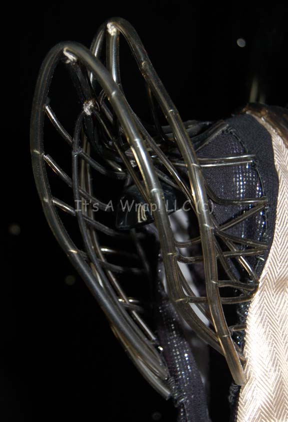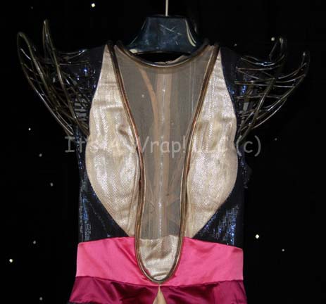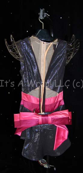 Description: A stunt version of the San Francisco Bar Waitress costume made for wear in Star Trek III: “Search for Spock”. The costume utilizes black, cream and pink fabric with a shear panel down the front. Rubber tubing creates two points on each shoulder and accents the collar and around the shear panel. On the back is a large removable pink bow. The costume has electronic capabilities that are untested. Costume comes complete with costume tag that reads, “Jeannie Coulter as stunt dbl, San Francisco Bar, Sc 79-83”.