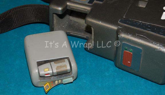 Description: A prop Starfleet away team medical case like those appearing in episodes of Star Trek: The Next Generation, Deep Space Nine, and Voyager. The item is painted metallic gunmetal with multi-colored accents and details, non-functional embedded light bulbs (no internal electronics), white cadesus graphics applied to the sides, a no scratch foam pad adhered to the base, and a removable non-deployed tricorder that fits into the item. The tricorder is painted gray with a peeling graphical application and an acrylic sensor applied to it; the tricorder also features a sensor piece that is fixed to it. The carry case features a black nylon shoulder strap with an adjustable size and measures approx. 9.5 X 13.25 X 3 inches with a visible degree of scuffing on the raised surfaces, especially around the base.