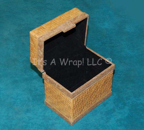 Description: A prop item similar to those featured in Star Trek: Enterprise episodes like “Civilization” or “Rajiin”. This item is a light tan, woven reed box, shellacked or treated to make it rigid, metal hinges on the back, accents around the lid and bottom made to look like marble or sandstone, and black, felt lining. The item measures approx. 6 X 9 X 9 inches.