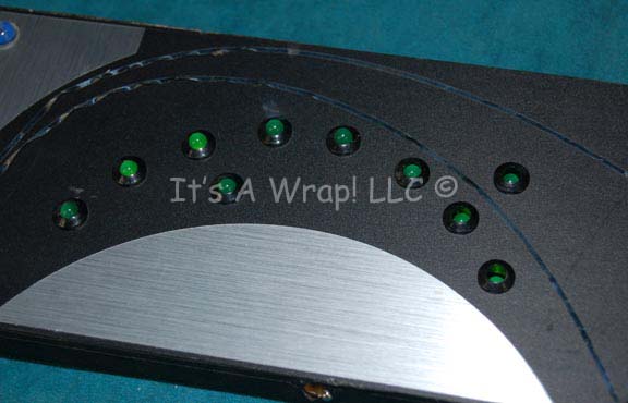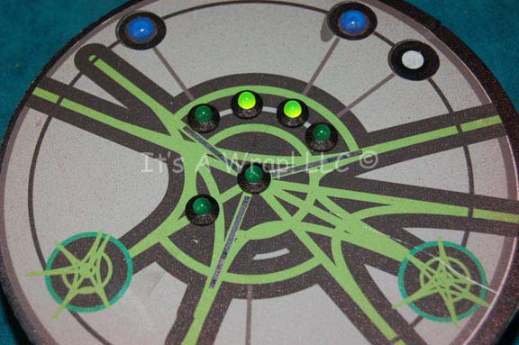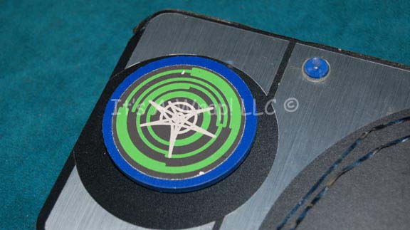 Description: A pair of Xindi themed console controls featured in episodes of Star Trek: Enterprise. The items are made from sheet plastic on fashioned micro-density fiber wood with embedded lights and faced with graphical applications. The display graphic on the round item is paper with Xindi readouts and iconographic lettering, the rectangular item features metallic silver accents and detail lines. The lines are warped due to their curvature. The items are both powered by internally mounted battery banks of three AA sized 1.5volt batteries, activated by a three position switch that in one position makes the lights blink sequentially. The items measure approx. 10 X 4 X 0.5 inches and 0.75 X 6 inches diameter. The rectangular item features a blue colored Xindi console button.