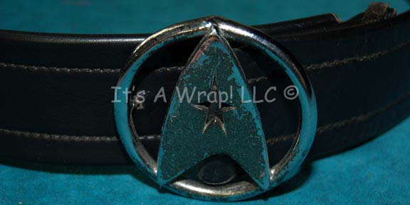 Description: A rare Starfleet crewman's belt made from black leather with a practical silver colored metal Starfleet logo buckle made for wear with a variety of Starfleet crewman’s costumes. Belts like this appeared in various Star Trek feature films like Star Trek II: The Wrath of Khan, and Star Trek VI: The Undiscovered Country. The belt measures approx. 35 inches long.