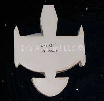 Description: A white foam core fashioned camera test model miniature of a Nasari starship like those appearing in the Star Trek: Voyager episode “Favorite Son”. The item is composed of multiple pieces of white foam core with white paper ‘hulls’ and is inscribed on its dorsal side ‘Nasari ½ scale’. The item depicts slight damage from the removal of a motion control rod on the ventral side and measure approx. 12.75 X 16.5 X 1.5 inches.