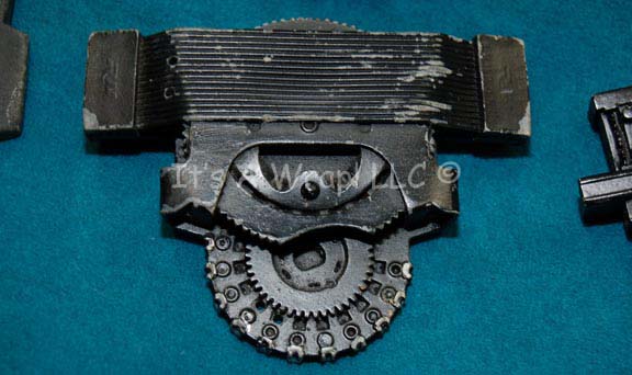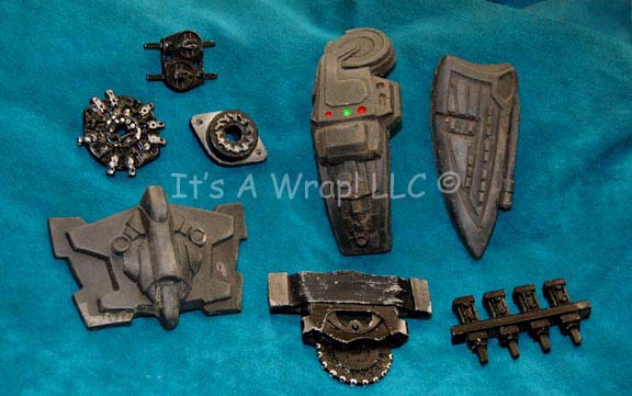 Description: A costume featured in various episodes of Star Trek: Deep Space Nine for wear by Jem’Hadar soldiers. This costume consists of a sleeveless, full-length, jumpsuit with the top half a black, spandex-like material, the bottom being neoprene over a gray fabric featuring a starburst pattern down the middle and stirrups for the feet. A distressed jacket matching the lower-half of the jumpsuit, and faux suede around the collar, multiple loose costume accents with rubber, resin, or metal components and some with Velcro placements. Multiple sewn in tags denote wear by multiple users.