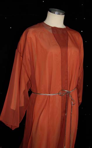 Description: A costume featured in the ninth Star Trek feature film “Insurrection”. This costume consists of a long-sleeved, iridescent orange, long tunic with a sheer, dark-rust colored over shirt, and a silver-colored tie around the waist. A sewn in tag reads ‘Karen Washington” and a costumer’s tag reads the same.