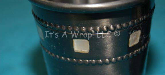 Description: A lot of two metal cups similar to those featured variously in Star Trek episodic television and feature films. This lot consists of two short tumblers, similar to “low ball” glasses, but in a dark-bronze colored metal instead of actual ‘glass’ with two rings of raised dots on the outside with a ring of square white ‘jewels’ between them. The item both measure approx. 4 inches in height and 3.5 inches in diameter.