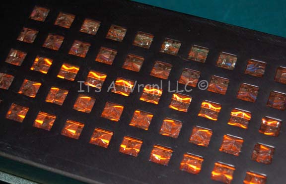 Description: A prop item believed to be featured in an episode of Star Trek: Enterprise. The item is a black metal case with multiple square openings for light to shine through, a pull handle on one end, and a series of rubber faux buttons on the other. The item lights up when a three position switch is activated on the reverse, one position allows the item to glow blue, the other direction equates to red-orange. The item measures approx. 10.5 X 5.5 X 2 inches.