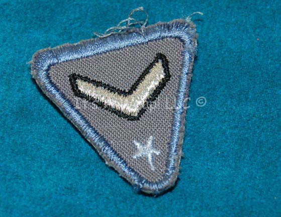 Description: A MACO (Military Assault Command Operations) rank patch created for use in various episodes of Star Trek: Enterprise. The item is a triangular patch colored blue with a white star and a single white chevron indicating the wearer to be a ‘private'. This item would be worn on right sleeve of a uniform top.