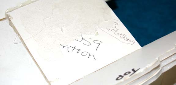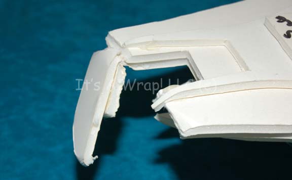 Description: A camera test model created for episodes of Star Trek: Deep Space Nine like “Ties of Blood and Water”. The item is a large model of a Jem’Hadar battle cruiser composed of multiple layers of white foam core depicting damage on the ventral side where a motion control rod was removed and in the bow where a piece has torn free. The item is inscribed ‘1/2 scale, scaled to D.S.9. station’ and ‘docks here’. The item measures approx. 27 X 23.5 X 6.5 inches.