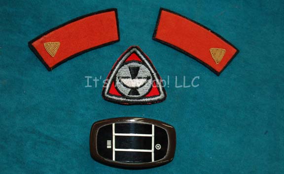 Description: A costume similar to those featured in Star Trek I: The Motion Picture. This costume is a tan, class-D, Starfleet uniform jumpsuit featuring an unattached plastic bio-monitor, an unattached pair of orange sciences division-rank strips for the shoulders with inverted triangle accents indicating the wearer to be a ‘chief petty officer', and an orange backed Epsilon IX assignment patch for the left breast. The costume is intended to be worn by male actors. A sewn in Western Costume tag reads ‘H. Teague’ and a costumer’s tag reads the same.