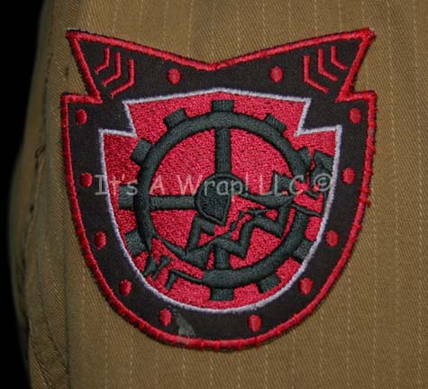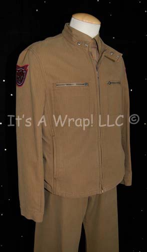 Description: A costume featured in the Star Trek: Enterprise episode “The Communicator”, wherein “Lt. Reed” (Dominic Keating) accidentally leaves his communicator on a pre-warp civilization, goes back for it where he and “Captain Archer” (Scott Bakula) are captured and accused of espionage. The costume is for wear by one of the military on the planet; a long-sleeved, olive-colored, button-down shirt, a matching fatigue-style jacket featuring patches on either arm of that planet’s military, breast pockets, a zip down the front, and a pair of corresponding trousers. A sewn in Enterprise tag in the shirt and trousers reads ‘Joseph Jagatic, #34’, and a tag in the jacket reads ‘Ron Balicki, #34’.