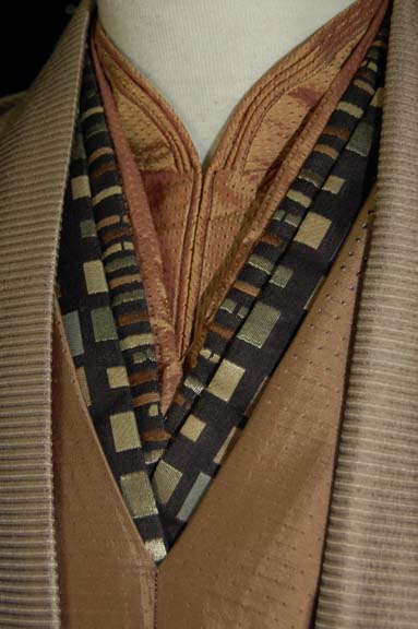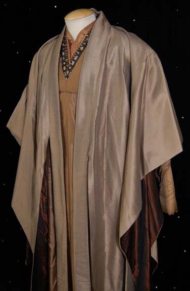 Description: A costume featured in the tenth Star Trek feature film “Nemesis”. This costume is that of one of the Romulan senators in the first scenes of the film, it consists of a long-sleeved, full-length, metallic-brown under robe featuring a textured, black dotted pattern and three false collars each with various colors and designs, quilted cuffs, zip adjustment, and a matching dickie. A long-sleeved, full-length, metallic-gold over robe featuring horizontal, textured stripes, 40 inch, open bell-sleeves, an iridescent brown lining, and a black, Romulan-style wig. A pinned in tag on the first costume reads ‘David Fahning’.