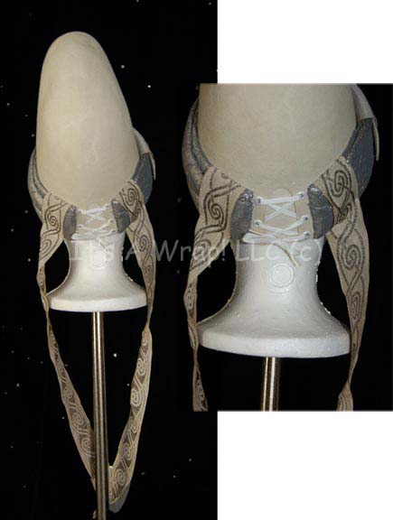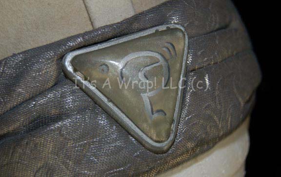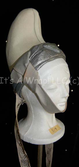 Description: A costume element of the style featured in “Search for Spock” and “The Voyage Home”. This item is a white, felt, Vulcan-style hat featuring textured, metallic-silver trim, and further gray trim forming a chinstrap, an attached necklace with gold-colored stripes in spiral and interlocking patterns. On the front of the hat and at the bottom of the attached necklace are triangular, off-white, faux jewels with Vulcan iconographic symbols. Three things make this item either rare or singular; the white color of the felt is the only such example thus far located, the chinstrap is stained with Vulcan makeup residue, and the necklace attached to the hat with the second jewel. A sewn in Paramount tag reads ‘5-1’.