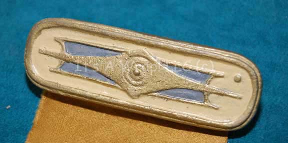 Description: A wire backed cast resin Starfleet Academy ribbon badge featured in the Star Trek: Starfleet Academy personal computer game released in 1997. The item is nearly identical to the resin bars featured as backing for Starfleet emblem badges worn by officers in Star Trek feature films painted gold, off-white, and gray, it features an adhered wire backing and gold colored ribbon fabric.