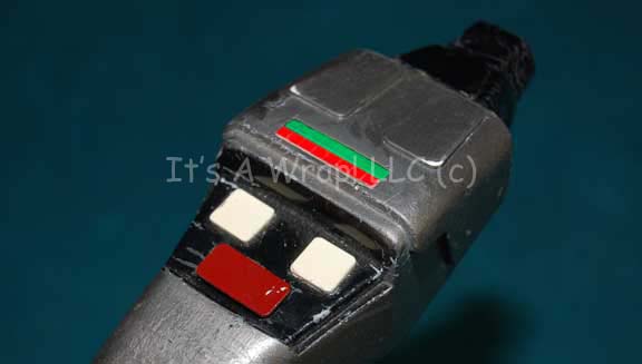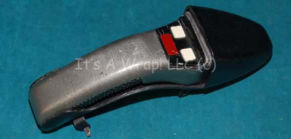 Description: A prop Starfleet type II phaser and corresponding holster like those appearing variously in Star Trek episodic television and feature films. The phaser is made from rigid, sturdy molded rubber painted metallic silver with black highlights, white colored faux buttons, a red painted thumb button that depresses slightly, and a painted green and red readout ‘gage’. A sparkly strip is adhered to the bottom of the item at the emitter tip. The holster is made from vacuum formed plastic colored back with a black felt interior lining made for a no scratch surface, features slide clasps, and fits the phaser prop perfectly. The paint on the phaser is in excellent condition and shows the barest of cracking or scuffs. In the holster the item measures approx. 8 X 2.25 X 2.5 inches.
