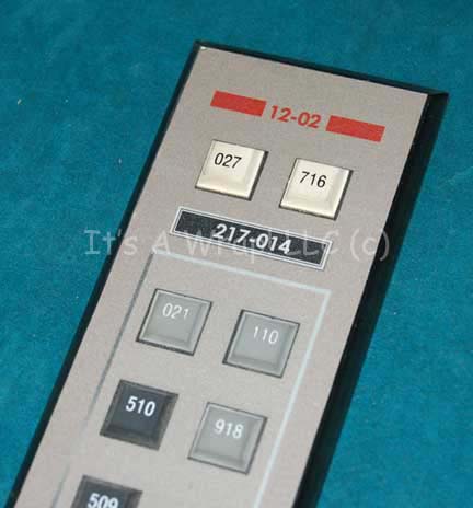 Description: A set dressing button board like those appearing variously in episodes of Star Trek: Enterprise. The item is a sheet of acrylic wit beveled edges and a graphical application adhered to the face that features adhered rubber faux buttons. The buttons are colored gray, black, and white. The item measures approx. 9.5 X 2.5 inches.