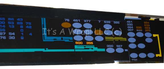 Description: A console computer interface like those appearing variously in Star Trek feature films and occasionally in episodes of Star Trek: The Next Generation. The item is composed of two sheets of clear acrylic with a multi-colored graphical application pressed between and with adhered together edges. The item depicts blue, green, and yellow, faux buttons and indicators with various numeric values. The item measures approx. 26 X 4.75 inches.