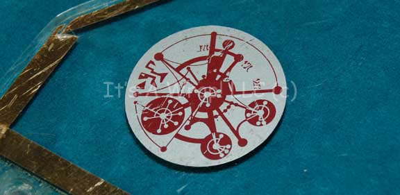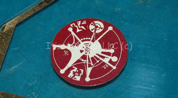 Description: A series of NUMBER clear acrylic sheets created as part of the science lab console in the Star Trek: Deep Space Nine episode “Playing God”. The items are fashioned to fit into a round console and each features a pair of circle shaped Cardassian themed graphical applications on the inner edge. Two of the items are covered in adhesive tape, some part of which are inscribed ‘science station’ and ‘save’.
