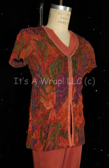 Description: A costume featured in the Star Trek: Deep Space Nine episode “Yesterday's Children”; wherein the “Defiant” find a planet peopled by their descendants and find that they will go back in time 200 years and crash land on this planet in two days when they try to leave. This costume is for wear by Davida Williams a child descendant of “Jadzia Dax” (Terry Farrell), “Lisa”, and is a short-sleeved, full-length, rust-colored jumpsuit with stirrups for the feet and a short sleeved, shirt featuring a multi-colored, textured, wrinkled feel to it, orange trim, and a zip down the front. Items were distressed for effect, sewn in tags denote wear in episodes of Voyager, and the costumer’s tag reads ‘DS9 520, Lisa, Davida Williams’.