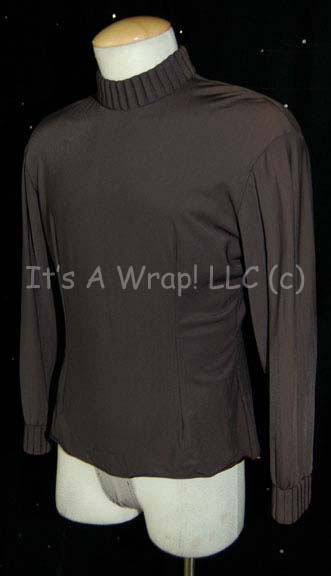 Description: A costume element featured in various Star Trek feature films from “The Wrath of Kahn” to the opening scenes of “Generations. This item is a long-sleeved, black, Starfleet uniform undershirt with a ribbed collar, Velcro at the neck, a zip down the back, and a strip of fabric that attaches between the legs. It is made for male wearers.
