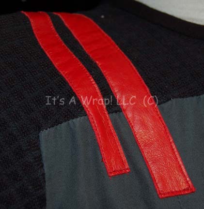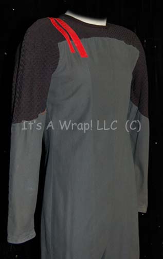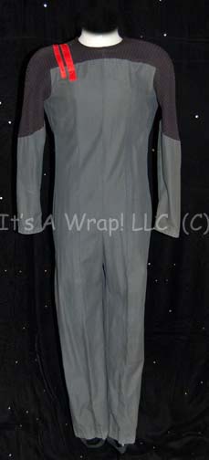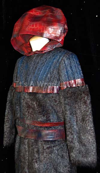 Description: A costume featured in the first episode of Star Trek: Enterprise and, chronologically, the first episode of Star Trek, “Broken Bow”. This costume is that of the alien man who approached “Reed” (Dominic Keating) and “Mayweather” (Anthony Montgomery) about an “inter-species performance” with the “butterfly dancers” seen there; it consists of gray, leather, overall-style trousers in the same criss-cross fashion as used in Jem’Hadar costumes. Included is a long-sleeved, full-length coat featuring gray, faux fur up to the chest, a horizontal stripe of red vinyl and matching leather in the same pattern as the trousers, an oversized hood and two belts of the same vinyl. A costumer’s tag reads ‘Enterprise Pilot, Broken Bow, Alien man, Von Epperson’.