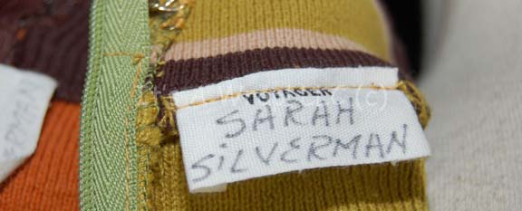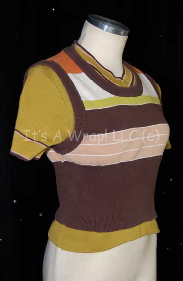 Description: A lot of costume elements featured in both part of the “Future’s End”; wherein “Voyager” is sent back to the 20th century and finds that they must stop a man from that time from using a 29th century time-travelling ship to go into the future to acquire ‘new technologies’. The items in this lot were all worn by cult favorite comedienne Sarah Silverman and consist of a lime-green, short-sleeved, mid-riff shirt with brown and white stripes around the collar and cuffs; a sleeveless, brown sweater featuring a wide white inset across the chest and horizontal stripes corresponding with the shirt. Both items have a zip up the back and a sewn in tag that reads ‘Sarah Silverman’.