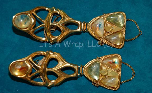 Description: A Vulcan maiden costume lot featured in Star Trek III: The Search for Spock. The costume is a two piece gown, a form fitting flesh tone under suit with a gauzy off white gown for wear over. Two pieces of gold-colored metal costume jewelry that consists of two parts; the first part features vaguely triangular shapes with a housing for a cloudy white and green “gem”, a strap/chain the goes around the wrist, a hinge that sets where the wrist would be, three triangular “gems” similar to the first, two “crystals” in the middle, on gold-colored setting with textured accents, a second chain around the hand and a final one that secures around the middle finger. The bracelets are in very good condition and padding on the underside is inscribed ‘Paulette’. Included are the original, matching, thin-strapped ‘Maserati’ name brand open-toed shoes.