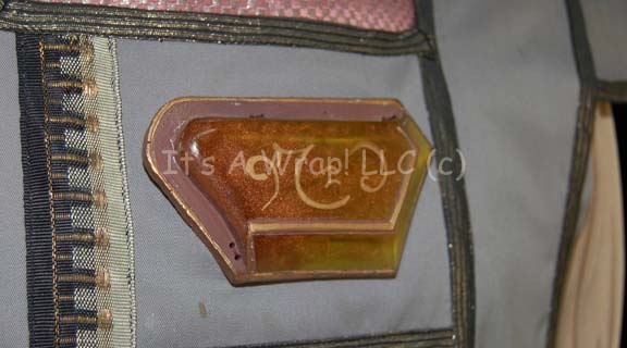 Description: A costume like those featured near the end of “The Search for Spock”, the beginning of “The Voyage Home”, and various instances in other episodes and films. This costume consists of an off-white tunic, tan-colored bell-sleeves of a slightly finer fabric, a dickie sewn on top featuring a reflective silver and violet checkerboard pattern and trousers matching the fabric of the sleeves. A sleeveless, gray tabard featuring gold-highlighted, black stripes across and down the front and back, white, black, and gold stripe down the right side, and trapezoidal-shaped, faux jewel with Vulcan iconographic symbol. Included is a rust-colored, Vulcan-style hat featuring trim and chinstrap of the same checkered pattern, addition trim in a tan color, and another faux jewel in a stylized arrow shape. The tabard has minor staining due to time and storage. A tag in the hat reads ‘Jay Crimp, 2-1’; an accompanying costumer’s tag reads ‘Vulcan Electrician, sc 34-36, Int. Bird of Prey’, and a sewn in tag in the costume reads ‘2-2’.