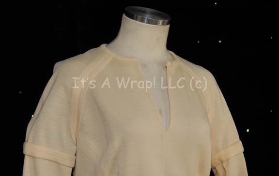 Description: A costume featured in the first Star Trek feature film. This costume consists of a crème-colored, Class-B, short-sleeved Starfleet uniform shirt and tan trousers. The lot comes with these unattached items; Command white shoulder division strips, matching white backed Epsilon IX assignment patch, and a plastic bio-monitor with painted accents. The costume is made for female wearers, is size 12, and features a sewn in Western costuming tag that reads ‘S-12’