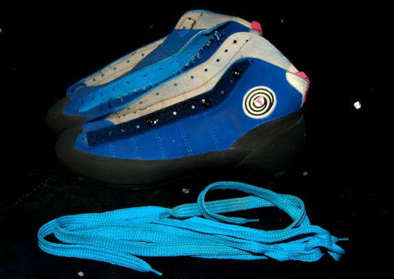 Description: A costume featured in Star Trek V: The Final Frontier like those made for wear by William Shatner as “Captain Kirk”. The costume is a rock climbing outfit composed of black trousers with neon green streaks in the lower legs, an iridescent purple sweater with orange fabric accents and collar, a climbing belt, and a pair of Boreal name brand climbing shoes with laces. The costume maintains minor distress in the form of a small hole over the spine and twin holes along the seam on either side of the waist that seems to have been done intentionally; fading due to either time and storage or purposefully is also evident but is still, overall, in quite good shape. The items feature no sewn in tags, inscriptions, or costumer’s tags.
