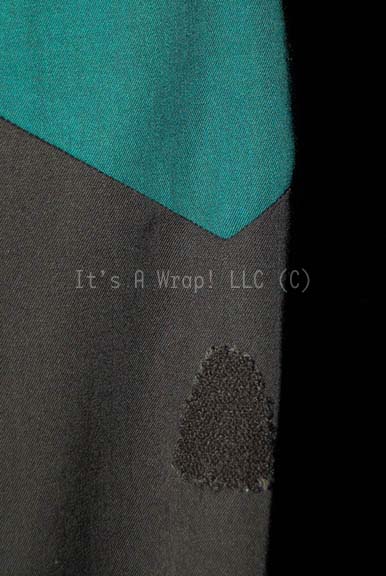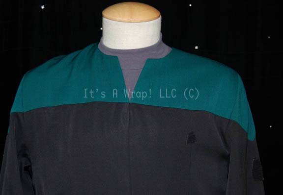Description: A costume featured in various episodes of Star Trek: Voyager for wear by Robert Picardo as “The Doctor”, the Emergency Medical Hologram; it is a long-sleeved, full-length, black, Starfleet uniform jumpsuit featuring Sciences Blue division colors around the shoulders, hoops at the waist for ‘away team gear’, a Velcro placement for a commbadge (not included) and a second specifically shaped Velcro placement for his ‘mobile emitter’ on the left arm, stirrups for the feet, and a long-sleeved, blue-gray undershirt. Two holes have been intentionally cut out of the undershirt; one on the right side of the stomach and one on the right arm but the costume maintains its aesthetic appeal when worn under the jumpsuit. A sewn in Voyager tag in both items reads ‘Robert Picardo’.