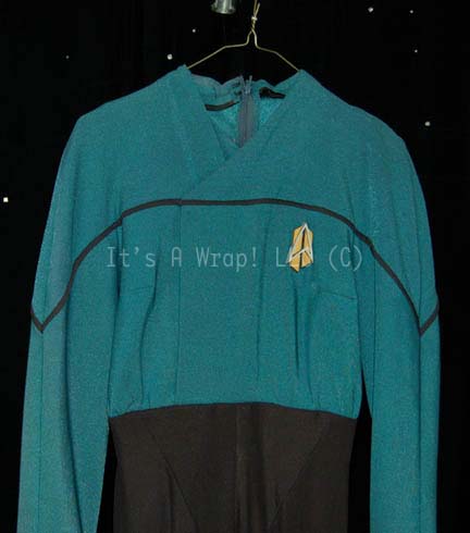 Description: A costume featured in the finale episode of Star Trek: Voyager “Endgame”. This costume is the future-style Starfleet uniform and was worn at the tenth-anniversary party sequence earlier in the first part of the episode, it consists of a long-sleeved, full-length, Sciences Blue jumpsuit featuring a false, wrap-around front, black piping across the chest, a Velcro placement for a commbadge (included but not attached) and black trousers. The interior lining has begun to deteriorate due to time and storage. A sewn in Voyager tag reads Brenda Kaye’ as does an attached costumer’s tag.