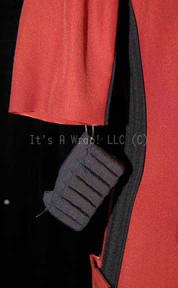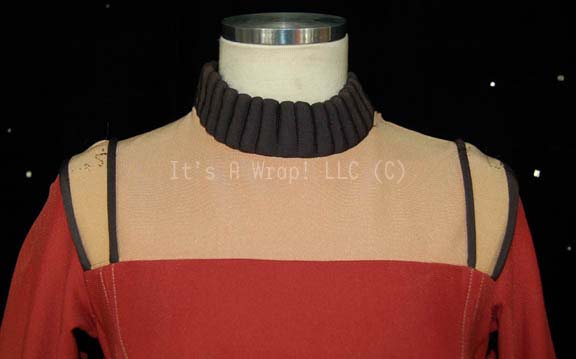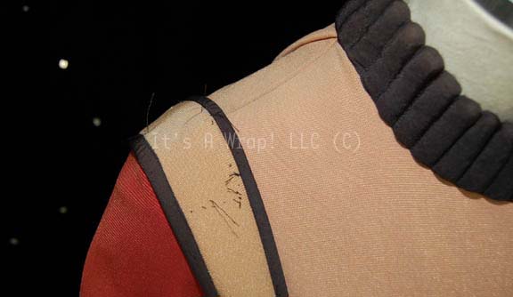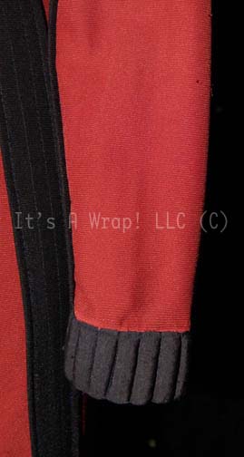 Description: A costume similar to those featured between the second Star Trek feature film, “The Wrath of Kahn”, and the opening scenes of the seventh, “Generations”. This costume is a burgundy jumpsuit featuring tan shoulders, black piping, ribbing around the collar and cuff, belt loops around the waist, and a black stripe that follows the length of the arm, down the ribs and ends at the ankle cuff. There are clasps, Velcro, snaps, and a zip down the back. The right sleeve has been cut off just above the elbow but includes the cuff that would have been on the sleeve; there are remaining threads from the removal of shoulder and cuff division strips.